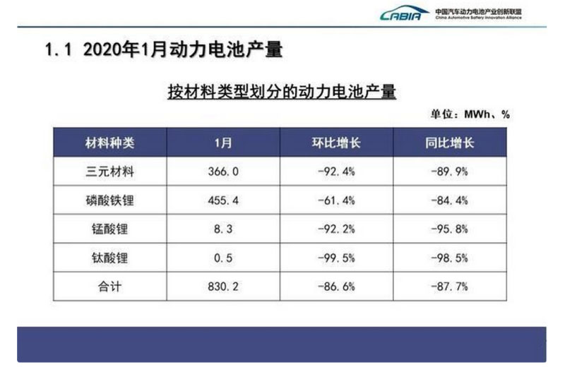 裝車量方面:2020年1月,我國(guó)動(dòng)力電池裝車量共計(jì)2.3GWh,同比下降53.4%,環(huán)比下降76.1%,年初呈現(xiàn)較大幅度下降。三元電池、磷酸鐵鋰電池裝車量分別為1.6GWh和0.7GWh,同比分別下降54.3%和49.1%。