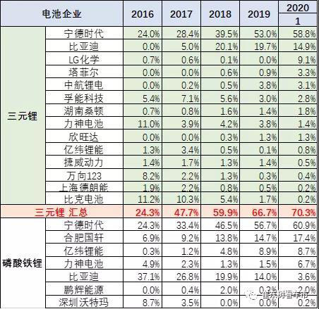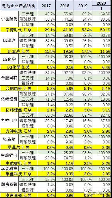 寧德時(shí)代的三元鋰的產(chǎn)量占比在快速提升中。尤其是寧德時(shí)代為代表2018年的三元鋰占比自身總量達(dá)到71%,2020年1月達(dá)到自身69%比例。