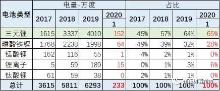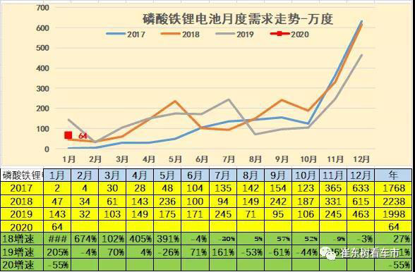 2019年磷酸鐵鋰電池,需求相對(duì)比較平穩(wěn)整體需求量達(dá)到1530萬(wàn)度。相對(duì)于2018年同期降低5%。2020年在1月份的電池需求較旺盛。