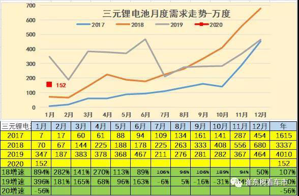 2020年1月電池需求230萬(wàn)度,大幅低于2019年1月的電池需求,好于2018年的中高位水平??紤]春節(jié)和補(bǔ)貼退坡前后的干擾因素,因此2020年1月的電池需求還稍差。