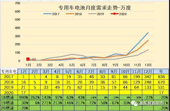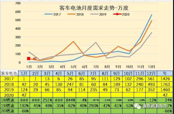 1月客車(chē)的電池需求較低,達(dá)到42萬(wàn)度電,同比下降66%。