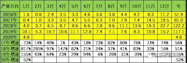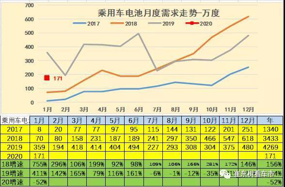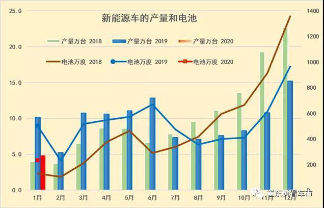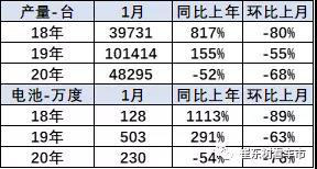 根據(jù)崔東樹(shù)個(gè)人測(cè)算,按照汽車(chē)生產(chǎn)合格證數(shù)據(jù):2020年1月新能源汽車(chē)產(chǎn)量4.8萬(wàn)臺(tái),同比下降52%;電池裝機(jī)總電量約230萬(wàn)度,同比下降54%,