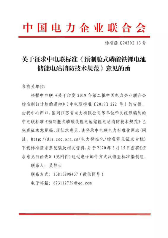 中電聯(lián)標準化管理中心關于征求中電聯(lián)標準《預制艙式磷酸鐵鋰電池儲能電站消防技術規(guī)范》意見的函