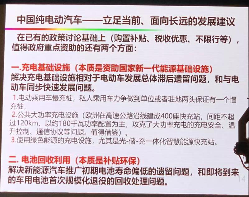 立足當(dāng)前,面向長(zhǎng)遠(yuǎn)的一個(gè)建議。我們希望購(gòu)置補(bǔ)貼、購(gòu)置稅優(yōu)惠、不限行等等。同時(shí),重點(diǎn)注意還有兩個(gè)方面,一個(gè)是充電基礎(chǔ)設(shè)施,充電基礎(chǔ)設(shè)施的本質(zhì)是資助國(guó)家新一代能源基礎(chǔ)設(shè)施。還有一個(gè)是電池回收利用,本質(zhì)是資助補(bǔ)貼環(huán)保,這是有制高點(diǎn)的。