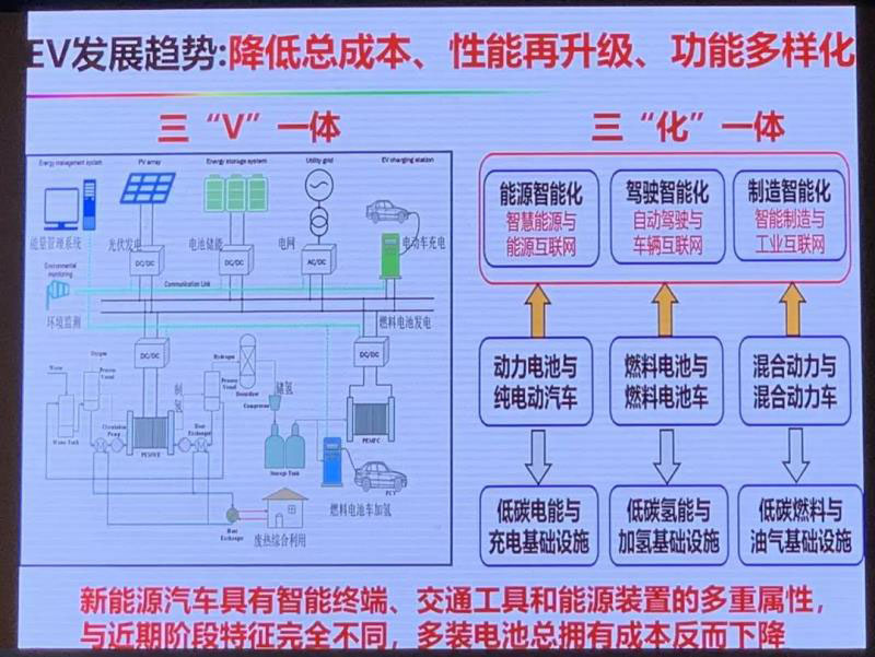 第三,功能多樣化,三V一體,V2G、V2H、V2X,V2H現(xiàn)在也開始了,就是建筑跟車輛,電驅(qū)系統(tǒng)一體化。三化一體,除了現(xiàn)在的電動(dòng)化,還有能源的低碳化、系統(tǒng)的智能化,這是藍(lán)海。所以新能源汽車具有智能終端交通工具、能源裝置的多重屬性,如果到功能多樣化階段的時(shí)候也許客戶反而需要讓你給他裝多一點(diǎn)電池,這樣總成本反而降低,因?yàn)樗梢岳秒姵刈鳛閮?chǔ)能給電網(wǎng)放電獲取收益。