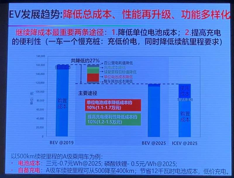 因此,總成本突破的重點(diǎn)是家用電動(dòng)汽車,尤其是性價(jià)比車型,很貴的車不是性價(jià)比客戶的選擇,但是我們家用轎車最重要的、量最大的還是性價(jià)比客戶,所以這是最需要突破的重點(diǎn)。這個(gè)重點(diǎn)要突破的就是購(gòu)置成本,因?yàn)槭褂贸杀炯矣玫囊呀?jīng)是低的。