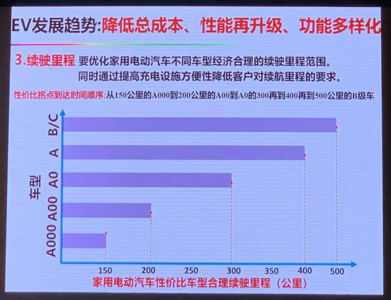 第一,要優(yōu)化家用電動(dòng)汽車不同車型經(jīng)濟(jì)合理的續(xù)駛里程范圍,比方說(shuō)A00級(jí)的、A0級(jí)的、A級(jí)的、B級(jí)的,這是不一樣的,不需要都強(qiáng)調(diào)續(xù)駛里程,但是最難的主攻目標(biāo)還是家用主流轎車就是A0級(jí)和A級(jí),大概是在350—450km這個(gè)范圍,這是最重要的需要我們突破的地方。