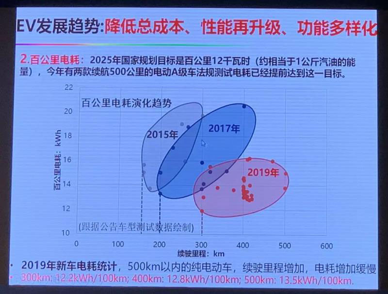 第二是百公里電耗。根據(jù)工信部檢測(cè)的電耗,可以看出,2015年、2017年到2019年續(xù)駛里程在升級(jí),電耗普遍下降,而且變化的幅度在收窄,300—500km這個(gè)變化范圍收窄了,這是很好的現(xiàn)象。比如今年有兩款500km的電動(dòng)轎車電耗在12 kWh /100km。