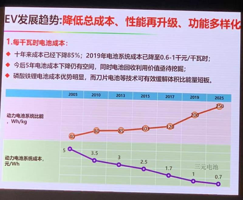 現(xiàn)在我們的電池系統(tǒng)成本已經(jīng)在0.6—1元/Wh,1元/ Wh是三元電池,低的是磷酸鐵鋰電池,今后5年電池成本仍有下降空間,比如說(shuō)我們?nèi)姵?025年前到0.7元/ Wh,磷酸鐵鋰還有下降的空間,但同時(shí)需要強(qiáng)調(diào)電池回收利用價(jià)值亟待挖掘,這方面我想磷酸鐵鋰電池成本優(yōu)勢(shì)是非常明顯的,而刀片電池等技術(shù)可有效的緩解以前磷酸鐵鋰電池體積比能量的短板。對(duì)于一個(gè)A0級(jí)車型的體積可以裝到將近60 kWh,基本上可以解決續(xù)航里程問(wèn)題。