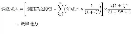 依據(jù)期初靜態(tài)投資、年成本、經(jīng)濟(jì)壽命、調(diào)峰能力等為參數(shù),測(cè)算和分析儲(chǔ)能等不同調(diào)峰資源的單位年調(diào)峰成本。計(jì)算公式為: