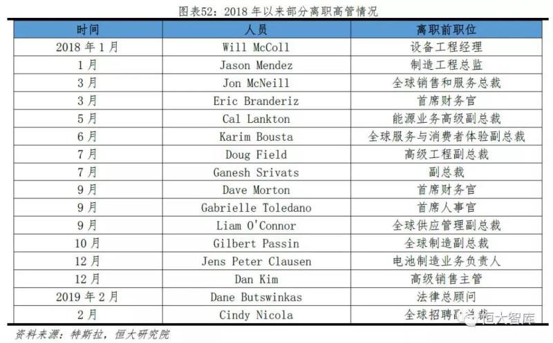 五、高層震蕩頻繁。特斯拉高層離職率呈增長(zhǎng)趨勢(shì),僅2018年全年,離職高管超過(guò)40人。除正常的人員調(diào)動(dòng)和行政方面高管離職,特斯拉核心團(tuán)隊(duì)的技術(shù)、財(cái)務(wù)、研發(fā)、法務(wù)管理人員均發(fā)生過(guò)離職,例如2016年5月離職的生產(chǎn)制造副總裁Greg Reichow與Josh Ensign、2017年4月離職的首席財(cái)務(wù)官JasonWheeler、2017年7月離職的電池技術(shù)總監(jiān)Kurt Kelty、2018年9月離職的首席人事官Gabrielle Toledano等。即便高管離職跳槽在硅谷科創(chuàng)企業(yè)非常普遍,但是管理層頻繁變動(dòng)仍不利于特斯拉穩(wěn)健發(fā)展。
