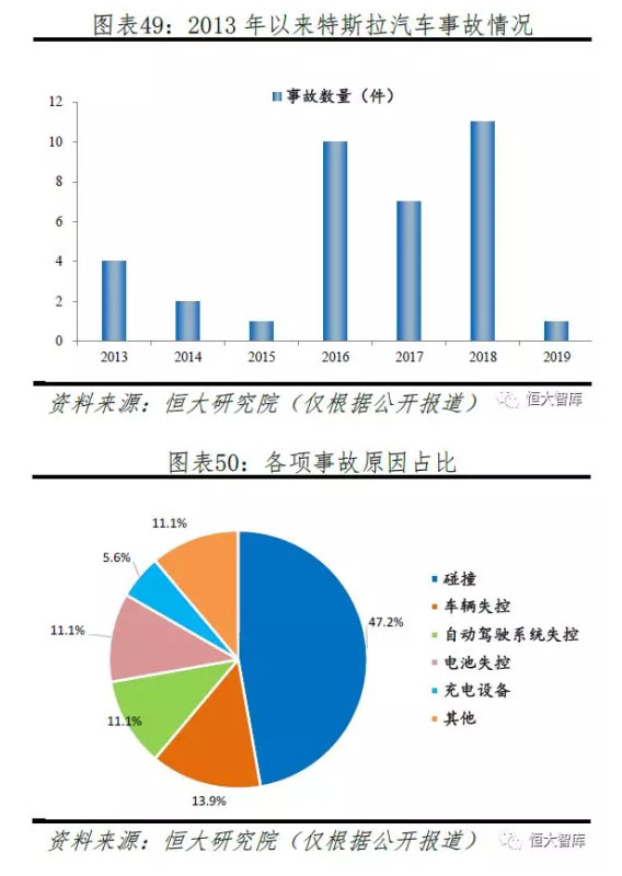 三、安全問(wèn)題。即便對(duì)產(chǎn)品經(jīng)過(guò)多次升級(jí)、采取各種安全措施,特斯拉汽車(chē)事故頻率依然呈上升趨勢(shì),2013年因頻發(fā)的汽車(chē)起火事件導(dǎo)致特斯拉股價(jià)跌幅最高達(dá)20%。根據(jù)已披露報(bào)道,從2013年至2019年3月特斯拉共發(fā)生36起汽車(chē)安全事故,47.2%為車(chē)輛碰撞導(dǎo)致,其中包括因?yàn)榫岂{、操作不當(dāng)、路障等而造成的碰撞。然而,不同于燃油車(chē),58.8%車(chē)輛碰撞引發(fā)電池燃燒,且由于動(dòng)力電池高燃燒時(shí)長(zhǎng),對(duì)駕駛員造成不同程度傷害。此外,事故傷亡程度深,36起事故中有9起事故造成人員死亡。