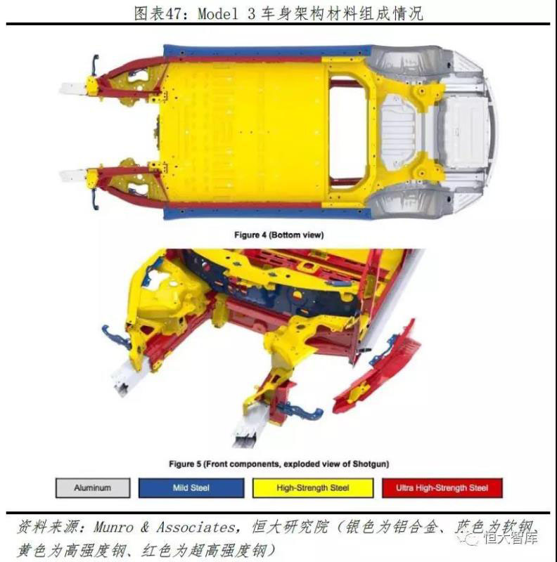 為壓縮成本,Model 3車(chē)身選擇鋼鋁混合。根據(jù)Munro & Associates的拆解報(bào)告和車(chē)身模型結(jié)構(gòu)圖可以發(fā)現(xiàn),Model 3采用鋁合金、軟鋼、高強(qiáng)度鋼和超高強(qiáng)度鋼這4種材料。由于單電機(jī)Model 3為后置電機(jī),為平衡重量,后車(chē)身大部分使用質(zhì)量更輕的鋁合金。大部分的縱梁、底板等則采用超高強(qiáng)度鋼,增加車(chē)身堅(jiān)固程度以提高安全性。然而,過(guò)多的不同類(lèi)型材料增加連接難度,Model 3車(chē)身連接方式便高達(dá)5種,且并沒(méi)有簡(jiǎn)化不必要配件,反而增加了整車(chē)制造成本。