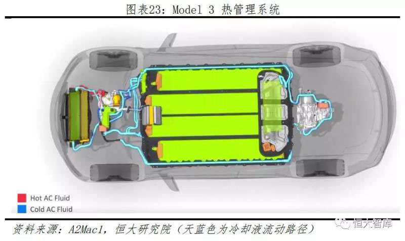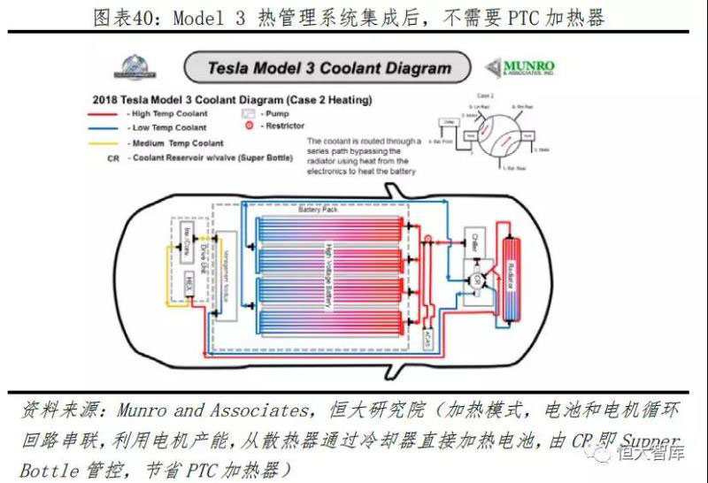 四、熱管理系統(tǒng)溫差設(shè)計(jì)合理,冷卻路線豐富流暢,均溫和能量管控能力突出。新能源汽車(chē)的熱管理系統(tǒng)主要包括整車(chē)、座艙、電池三方面,進(jìn)行整車(chē)溫度控制、客艙空調(diào)加熱制冷、電池過(guò)熱散熱過(guò)冷加熱等。目前,主流熱管理包括自然冷卻、液冷和直冷三種方案,特斯拉采取50%水和50%乙二醇為冷卻液的液冷方案,由四通閥實(shí)現(xiàn)的電機(jī)和電池冷卻循環(huán)串并聯(lián)結(jié)構(gòu)。由系統(tǒng)芯片算法控制,當(dāng)電池溫度超過(guò)設(shè)定目標(biāo)值時(shí),電池循環(huán)與電機(jī)循環(huán)相互獨(dú)立,采用并聯(lián);電池溫度低于設(shè)定目標(biāo)值時(shí),電池循環(huán)與電機(jī)循環(huán)采取串聯(lián),利用電機(jī)余熱為電池和座艙加熱,多余熱量將由進(jìn)氣口的熱量交換器排放出去。此方案充分利用車(chē)內(nèi)所有部件熱量,使熱量有效循環(huán)游走,極大提高電池單體散熱性和電池單體間溫度一致性。因此,無(wú)論冬季還是夏季所對(duì)應(yīng)的極端氣候,特斯拉車(chē)輛溫差控制保持在2℃內(nèi),體現(xiàn)強(qiáng)大的溫度管控能力。