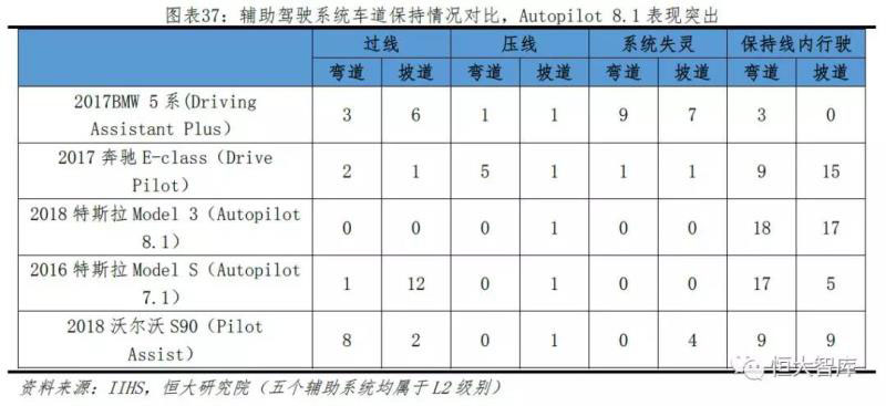 從車(chē)道保持情況來(lái)看,根據(jù)美國(guó)公路安全保險(xiǎn)協(xié)會(huì)IIHS數(shù)據(jù),在直徑1300-2000英尺(396-617米)不同的空曠道路測(cè)試環(huán)境下,對(duì)比寶馬5系、奔馳E、Model 3/S和沃爾沃S90五輛同類(lèi)別轎車(chē),設(shè)定3種情況各6種測(cè)試的共18次測(cè)試條件,Autopilot8.1輔助駕駛系統(tǒng)在彎道和坡道的車(chē)輛保持能力最為突出,僅在坡道表現(xiàn)過(guò)一次壓線。