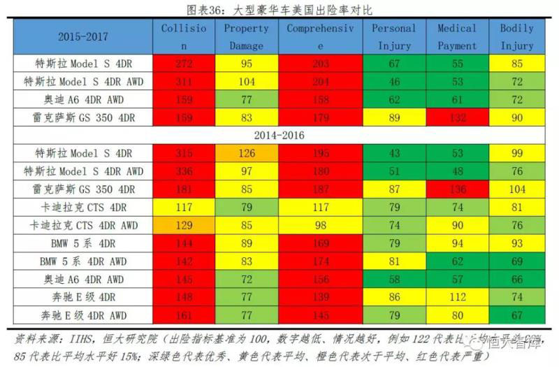 對(duì)比同等大型豪華轎車(chē)的出險(xiǎn)率,從三項(xiàng)車(chē)體保護(hù)險(xiǎn)來(lái)看,特斯拉與其他豪華轎車(chē)類(lèi)似,表現(xiàn)較差,且數(shù)據(jù)遠(yuǎn)遠(yuǎn)高于其他同類(lèi)型轎車(chē),說(shuō)明特斯拉單車(chē)平均碰撞率高于行業(yè)平均水平,這也暗示由于系統(tǒng)誤判或者駕駛員忽視容易造成更多碰撞。但從三項(xiàng)人體保護(hù)險(xiǎn)來(lái)看,特斯拉Model S低于平均、基本處于優(yōu)秀水平,說(shuō)明Model S對(duì)自身車(chē)主和對(duì)方車(chē)主有良好的人身保護(hù)。
