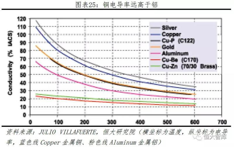 銅較鋁帶來(lái)更高的電導(dǎo)效率。從各項(xiàng)金屬不同溫度下的電導(dǎo)率來(lái)看,在相同溫度下,銅的電導(dǎo)率遠(yuǎn)高于鋁。如果將電機(jī)轉(zhuǎn)子結(jié)構(gòu)原材料換成銅,電機(jī)工作效率將大大提高。