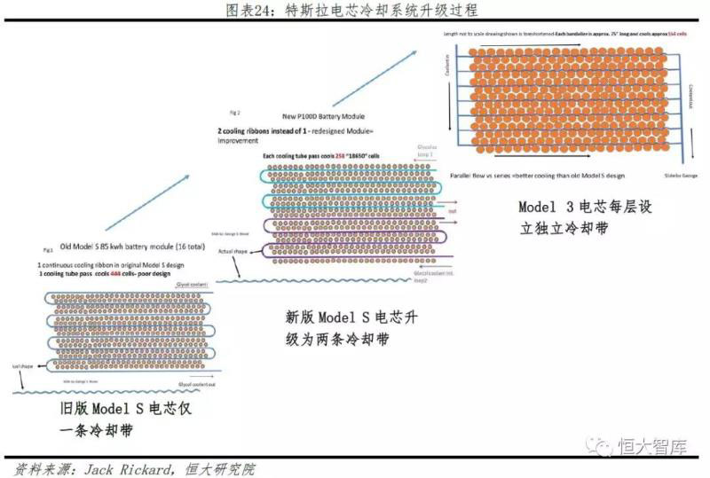 此外,由于電池單體材料升級(jí)、體積增大,電芯容量和密度大幅提高,導(dǎo)致電池化學(xué)熱敏感性提升,可燃點(diǎn)從18650電池的約175℃降低為2170電池的約65-82℃,對(duì)電池冷卻系統(tǒng)提出更高要求。對(duì)比舊版Model S 85、新版Model S P100與Model 3可以發(fā)現(xiàn),電池冷卻系統(tǒng)階段性升級(jí),從早期的單條冷卻帶到如今的每層獨(dú)立冷卻帶,為新版2170電池提供更好的溫度管控,極大提高電池冷卻運(yùn)行效率。