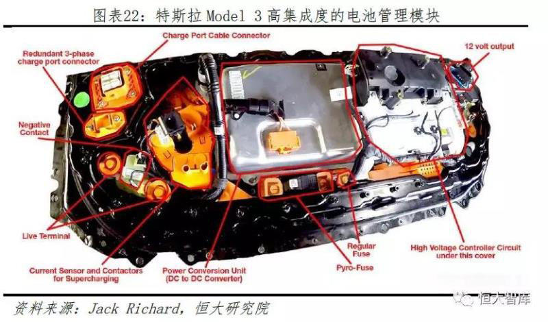 特斯拉的BMS具有兩個(gè)特點(diǎn)。一、高精度。根據(jù)Sandy Munro和Jack Rickard等人對(duì)Model 3的拆解,Model 3的BMS可以將23-25個(gè)獨(dú)立電池組的電壓差控制在2-3mV,遠(yuǎn)低于其他普通電動(dòng)車(chē)的水平;二、高集成度。特斯拉BMS模塊集成了高壓控制器、直流轉(zhuǎn)換器和多個(gè)傳感器,由此可以減少內(nèi)部通信所需的高壓線束,最終減輕總重量并降低成本。