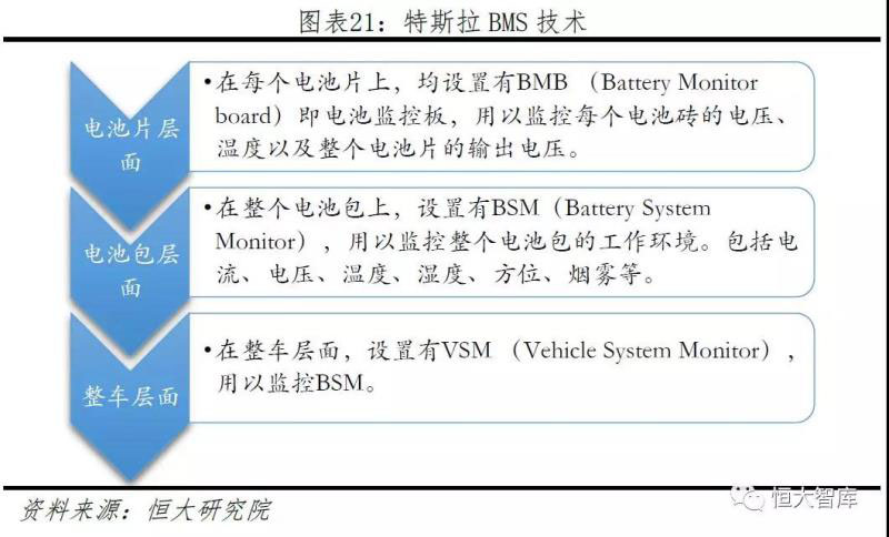 三、高精度的電池管理系統(tǒng)保障電池安全、提高循環(huán)壽命。電池管理系統(tǒng)(Battery Management System, BMS)是特斯拉最核心的幾項(xiàng)技術(shù)之一。不同于鉛酸電池,鋰電池由于具有非線性的充放電曲線,造成不論是電芯或是電池包層面,監(jiān)測(cè)、預(yù)估和管理的難度都大大增加。如果管理不當(dāng),個(gè)別電芯的過(guò)度充放電將引起永久性的電池?fù)p傷,造成整個(gè)電池系統(tǒng)電壓、溫度不穩(wěn)定,嚴(yán)重的將導(dǎo)致熱失控事件。因此電池管理系統(tǒng)對(duì)電池容量、循環(huán)壽命和安全性均起著至關(guān)重要的作用。自從Model S開(kāi)始,特斯拉就采用了NCA為正極材料的電芯,與業(yè)界更加主流的高鎳NCM材料相比,NCA雖然能量密度更高,但是循環(huán)壽命更短,穩(wěn)定性也更差,因此對(duì)BMS提出了更高的要求。