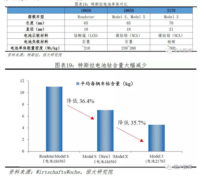 一、不斷尋找最優(yōu)材料,降低成本、提升性能。電池單體化學(xué)物質(zhì)成分和比例的不同將直接影響電池性能表現(xiàn),三元材料中,鎳主要作用為提高材料整體能量密度,鈷主要作用為穩(wěn)定材料層狀結(jié)構(gòu),提高整體循環(huán)性能。然而,過(guò)高的鎳含量會(huì)導(dǎo)致化學(xué)成分不穩(wěn)定,過(guò)高的鈷含量會(huì)降低能量和容量,并且由于礦產(chǎn)稀缺性,鈷價(jià)一直居高不下。為此,特斯拉不斷攻克電池材料配比,試圖找到最優(yōu)方案。橫向來(lái)看,當(dāng)競(jìng)爭(zhēng)對(duì)手2013年做磷酸鐵鋰電池與NCM111時(shí),特斯拉已經(jīng)開(kāi)始在Model S上應(yīng)用高能量密度NCA三元電池;當(dāng)競(jìng)爭(zhēng)對(duì)手2017年開(kāi)始由低鎳材料過(guò)渡到NCM622/NCM811高鎳正極材料時(shí),特斯拉已經(jīng)探索更高能量密度的硅碳負(fù)極應(yīng)用,特斯拉在電池技術(shù)的積累使其電池能量密度和整車(chē)?yán)m(xù)航里程能領(lǐng)先競(jìng)爭(zhēng)對(duì)手?jǐn)?shù)個(gè)身位??v向來(lái)看,特斯拉一直堅(jiān)持使用NCA作為電芯正極材料,并不斷提高鎳含量、降低鈷含量。對(duì)比最新Model 3與Roadster兩款汽車(chē),特斯拉平均每款車(chē)鈷含量降低約60%。根據(jù)特斯拉2018年一季度報(bào)告,Model 3的電芯能量密度超過(guò)其他任何一款競(jìng)品所使用的電芯,其鈷含量低于主流電芯制造廠即將量產(chǎn)的下一代NCM811電芯產(chǎn)品。
