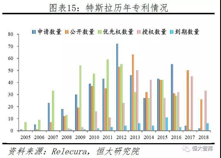 美國(guó)專(zhuān)利分析公司Relecura數(shù)據(jù)顯示,截止2018年,特斯拉共計(jì)專(zhuān)利/專(zhuān)利族408件。從歷年情況來(lái)看,2009年后,專(zhuān)利申請(qǐng)數(shù)量與授權(quán)數(shù)量開(kāi)始激增,主要與Model S的研發(fā)準(zhǔn)備有關(guān),申請(qǐng)數(shù)量于2012年到達(dá)頂峰,授權(quán)數(shù)量于2013年到達(dá)頂峰。從申請(qǐng)國(guó)家來(lái)看,美國(guó)申請(qǐng)數(shù)量保持領(lǐng)先,近年來(lái)歐洲與中國(guó)申請(qǐng)數(shù)量急速增加,這與特斯拉全球化的市場(chǎng)戰(zhàn)略分不開(kāi)。