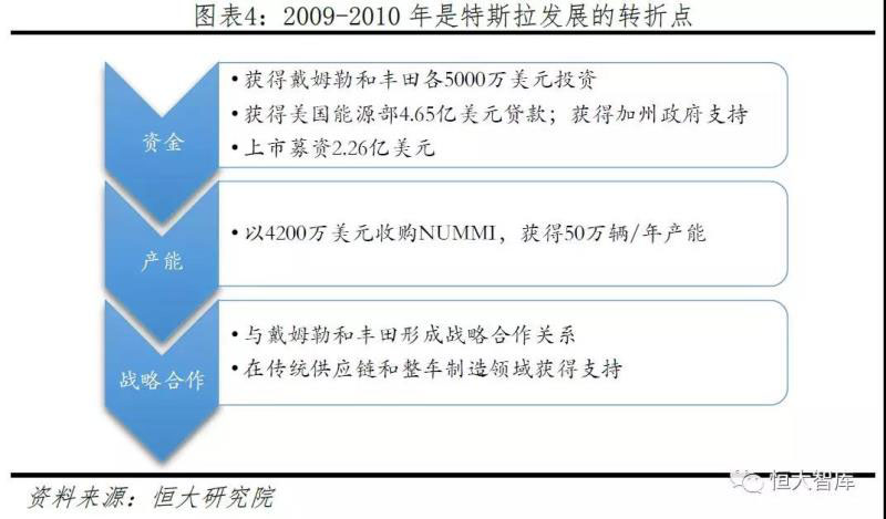 奔馳和豐田的戰(zhàn)略投資使特斯拉獲得資金與品牌雙重背書(shū)。2009年1月底特律車(chē)展之后,戴姆勒向特斯拉訂購(gòu)了4000顆電池組用于奔馳A-Class車(chē)輛測(cè)試,并且以5000萬(wàn)美元取得了特斯拉10%的股份,形成了合作伙伴關(guān)系。2010年5月特斯拉獲得豐田5000萬(wàn)美元投資,取得3%股份。與兩家傳統(tǒng)車(chē)企巨頭的戰(zhàn)略合作不僅解決了特斯拉資金方面的燃眉之急,更讓特斯拉快速學(xué)習(xí)到生產(chǎn)、管理經(jīng)驗(yàn)和模式的know-how。此外,特斯拉還以4200萬(wàn)美元低價(jià)收購(gòu)原豐田與通用合資、年產(chǎn)能50萬(wàn)輛的工廠NUMMI,為大規(guī)模量產(chǎn)打下基礎(chǔ)。
