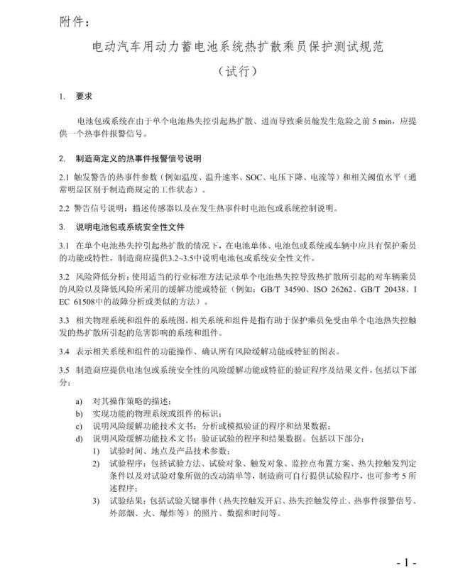 1.自2019年11月12日起,申請《公告》新能源汽車產(chǎn)品準(zhǔn)入時,企業(yè)可自愿按《熱擴(kuò)散測試規(guī)范》增加熱擴(kuò)散測試項(xiàng)目,提交由第三方檢測機(jī)構(gòu)出具的檢測報告。
