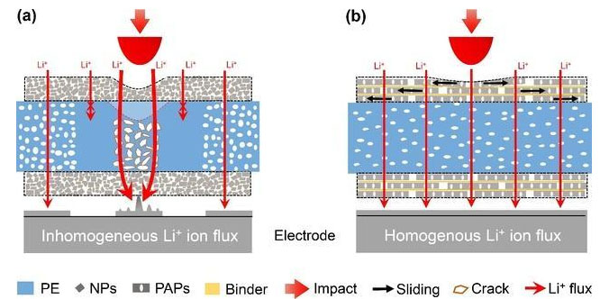 為解決這一難題,中國科大的研究團(tuán)隊(duì)在深刻理解自然界珍珠母層高韌性原理基礎(chǔ)上,在聚乙烯隔膜表面構(gòu)建仿珍珠層的“磚泥”有序結(jié)構(gòu)。在受到外力沖擊時(shí),仿珍珠母涂層通過片片滑移的作用,有效擴(kuò)大受力面積,耗散沖擊的應(yīng)力,從而有效保護(hù)了隔膜內(nèi)部孔結(jié)構(gòu),維持電池內(nèi)部均勻的鋰離子流。