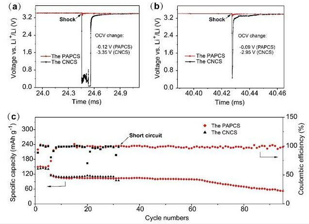 據(jù)介紹,相對(duì)于使用商業(yè)陶瓷隔膜的軟包電池,采用仿珍珠層隔膜的軟包電池在沖擊時(shí)表現(xiàn)出較小的開路電壓變化和較好的循環(huán)穩(wěn)定性以及高的安全性。
