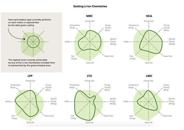 根據(jù)落基山研究所的預(yù)測(cè),直到2025年,大部分采用的是鋰離子電池或其衍生產(chǎn)品。與太陽(yáng)能發(fā)電行業(yè)發(fā)展相反,鋰離子電池的廣泛應(yīng)用取決于其多樣性。不同離子化合物的不同形式的鋰離子電池都有其自身的優(yōu)勢(shì)和劣勢(shì),如下圖所示: