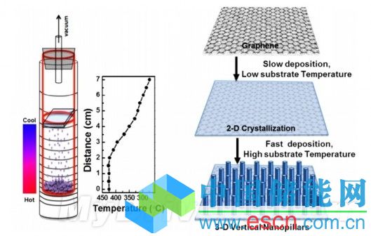 現(xiàn)在,該研究小組發(fā)明了一種新的簡單、靈活的技術(shù),可以生產(chǎn)這種“納米草”。他們將半導(dǎo)體原材料和石墨烯底料放在真空的溫度梯度爐中,開始的低溫能夠先形成一個超薄薄膜,然后隨著溫度的提升,半導(dǎo)體化合物便向硬幣一樣一層層的推疊,一個“納米草”便形成了。
