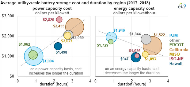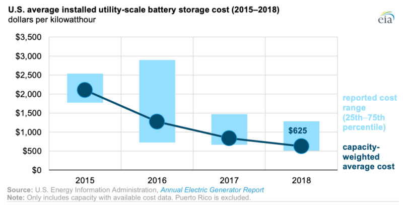 中國(guó)儲(chǔ)能網(wǎng)訊:根據(jù)美國(guó)能源信息署的數(shù)據(jù),美國(guó)公用事業(yè)規(guī)模電池存儲(chǔ)的平均能量容量成本已從2015年的2152美元/千瓦時(shí)迅速降至2018年的625美元/千瓦時(shí)。截至2018年底,美國(guó)的電池裝機(jī)功率容量為869兆瓦(電池在給定時(shí)刻所能提供的最大功率),電池能量容量為1236兆瓦時(shí)(電池可儲(chǔ)存的總能量)。
