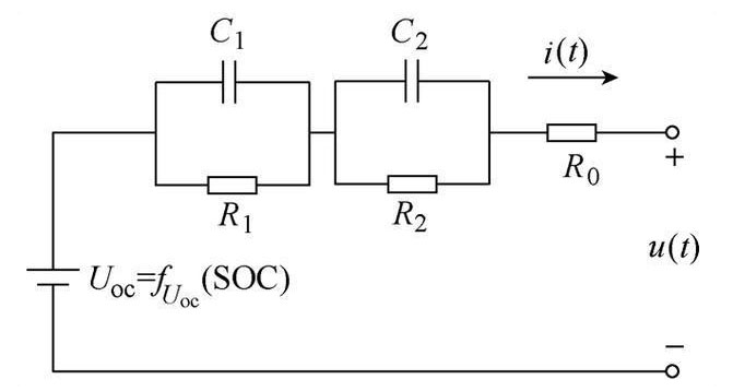 針對(duì)目前電池狀態(tài)估計(jì)精度較低、時(shí)效性差等問(wèn)題,本文采用鋰離子電池二階Thevenin等效電路模型,并運(yùn)用自適應(yīng)無(wú)跡卡爾曼濾波(Adaptive Unscented Kalman Filter, AUKF)算法對(duì)電池狀態(tài)進(jìn)行實(shí)時(shí)估計(jì)。