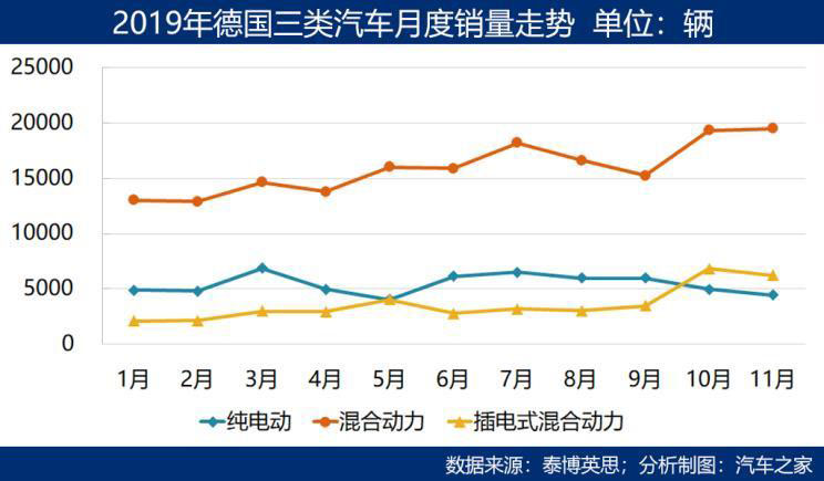 3、德國的電動(dòng)汽車銷量呈走低之勢,盡管政府承諾將提高對(duì)電動(dòng)汽車的補(bǔ)貼,但混動(dòng)市場在量與走勢上都更領(lǐng)先;