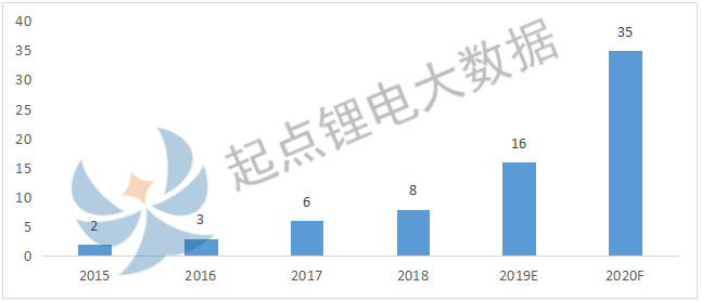 根據(jù)起點(diǎn)研究院(SPIR)測(cè)算,按商用車(按3年電池壽命假設(shè))和乘用車(5年)所使用的動(dòng)力鋰電池報(bào)廢量,2015年國(guó)內(nèi)報(bào)廢動(dòng)力電池累計(jì)為2萬(wàn)噸,對(duì)應(yīng)的電池回收率僅2%。到2020年前后,累計(jì)報(bào)廢量將達(dá)到35萬(wàn)噸。如下圖表所示。