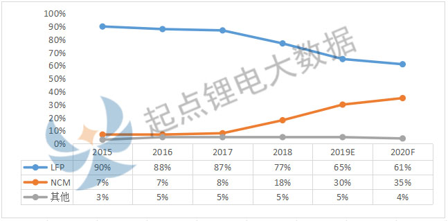 2015-2020年動(dòng)力鋰電池退役量-按電池類型占比(%)趨勢(shì)圖