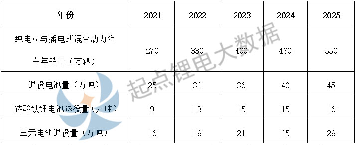 2021-2025年動(dòng)力電池退役規(guī)模預(yù)測(cè)