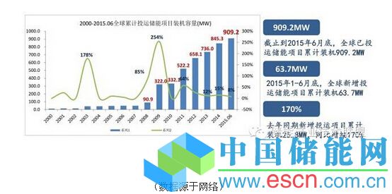 2015年上半年,全球儲(chǔ)能市場持續(xù)發(fā)酵,應(yīng)用需求進(jìn)一步增大。根據(jù)CNESA數(shù)據(jù)庫統(tǒng)計(jì),截止到2015年6月底,全球新增儲(chǔ)能項(xiàng)目45個(gè),裝機(jī)307.5MW,其中投運(yùn)項(xiàng)目14個(gè),裝機(jī)63.7MW;在建項(xiàng)目4個(gè),裝機(jī)47.5MW;規(guī)劃的項(xiàng)目27個(gè),裝機(jī)196.3MW。