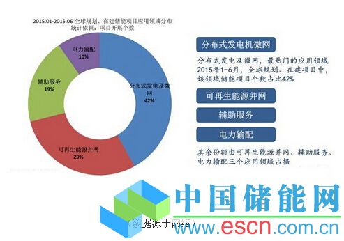 從應(yīng)用分布來看,上半年的應(yīng)用熱點(diǎn)是分布式發(fā)電及微網(wǎng),其項(xiàng)目數(shù)量占規(guī)劃及在建項(xiàng)目總數(shù)的42%。其次是可再生能源并網(wǎng),輔助服務(wù)和電力輸配領(lǐng)域。