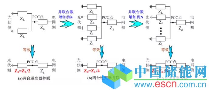 引起逆變器并聯(lián)諧振的原因有很多,如逆變器控制技術(shù)、逆變器的電路結(jié)構(gòu)及參數(shù)選擇等,學(xué)術(shù)界也有很多類(lèi)似的研究。但最根本的原因是隨著并聯(lián)數(shù)量的不斷增加,逆變器阻抗不斷降低并與電網(wǎng)阻抗不匹配造成的。