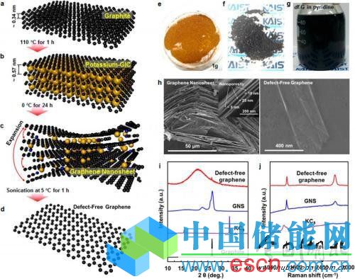 中國儲能網(wǎng)訊:制備無缺陷石墨烯的步驟:(a)石墨烯,(b)鉀-石墨烯夾層復合物,(c)石墨烯納米片,(d)無缺陷石墨烯。數(shù)字圖像:(e)鉀-石墨,(f)石墨納米片,(g)無缺陷石墨。(h)掃描圖片:(左邊)石墨納米片,(右邊)無缺陷石墨。(i)和(j)分別為(a-d)圖中材料的X射線衍射與拉曼圖譜的對比。上述圖片來自2014年的美國化學學會的帕克等人。