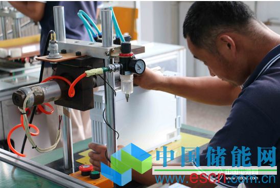 威海東生能源科技有限公司工作人員向中國電池網(wǎng)演示機床切割電池