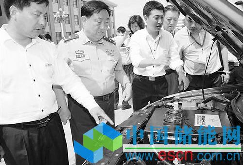 周國泰院士(左二)和科技人員一起檢驗汽車用高能鎳碳超級電容器。