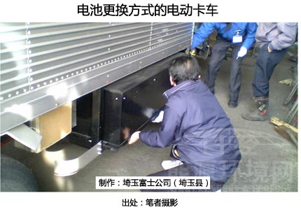 在日本,“改造電動(dòng)汽車”領(lǐng)域進(jìn)行著這種方式的嘗試。埼玉富士公司制作了采用電池更換方式的電動(dòng)卡車(載重2噸),并于2011年6月8日通過(guò)了車檢。媒體對(duì)其改造作業(yè)的情形也進(jìn)行了介紹。