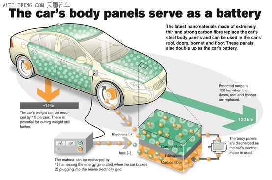 沃爾沃所參與開發(fā)的新材料由碳纖維、聚合樹脂以及納米結(jié)構(gòu)電池組成。該材料的使用,可使車身和車內(nèi)零部件成為儲電設(shè)備。