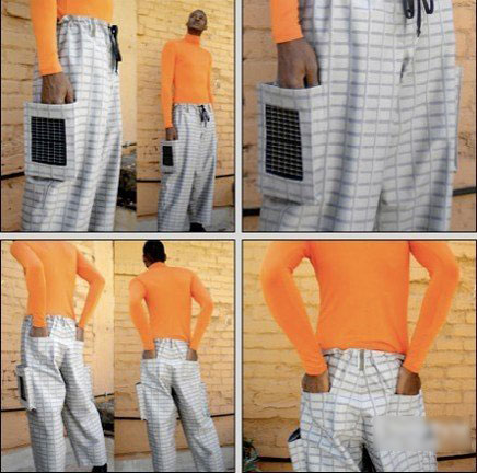 據(jù)悉,太陽(yáng)能褲子的發(fā)明者是日本發(fā)明家SilvrLining。他介紹說(shuō),這條太陽(yáng)能工裝褲的外形設(shè)計(jì)時(shí)尚,為低腰休閑褲款式,腰部有黑繩能當(dāng)腰帶,穿起來(lái)既運(yùn)動(dòng)又休閑。褲子的布料圖案為近幾年十分流行的黑色暗格,且采用特殊的紡織布料制成,能夠起到良好的防水防油漬效果。褲腿的兩旁分別縫制有一個(gè)大口袋,每個(gè)口袋上面安置了高科技太陽(yáng)能電池板。