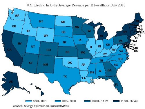 在美國,各州電力成本水平波動巨大,華盛頓州最為便宜,每千瓦時8.87美分,而夏威夷則最高,每千瓦時為36.61美分,在電動汽車推廣較好的加利福尼亞州,每千瓦時為16.71美分。美國全國平均水平為12.61美分/千瓦時。