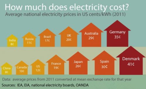 縱觀世界其他地區(qū),以下圖表列舉了一些國家2011年的平均電力成本(單位:美分/千瓦時),從中可以看出丹麥的電力成本比較好,印度、中國和加拿大則相當(dāng)便宜。丹麥的電力成本比印度高出約525%。
