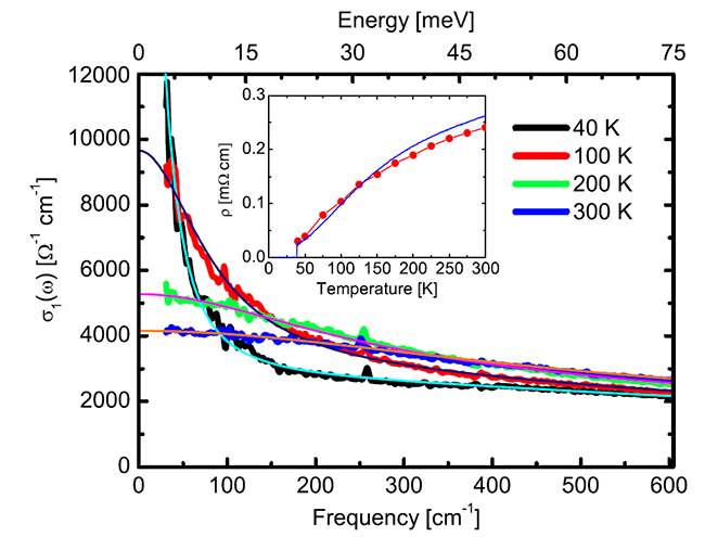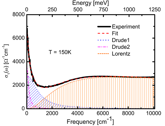 圖2 光電導曲線可以分解為一個寬的Drude, 一個窄的Drude (分別代表兩種具有不同散射率的載流子), 和Lorentz項 (表示帶間躍遷)。